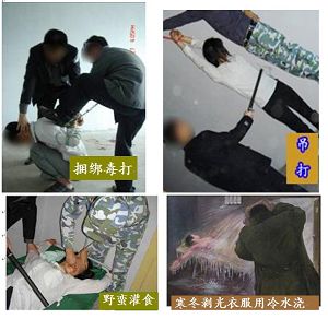 一张只有三根横方的铁床,躺在上面的人只能勉强被支撑住头、臀、脚三个部位,两头各有两个铁环,被捆绑在上面的人,两手两足被固定在铁环里,呈大字形分开……不可转侧,不可排泄,难以进食,痛楚淋漓虚脱至极限才松开。修炼者如不“转化”妥协放弃修炼,待体力稍有恢复就再绑上继续折磨。
