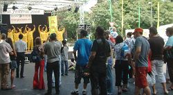 主办者Jimmy可没有被这个吓倒。 “我收到了很多匿名的电话,质问我为什么又邀请法轮功学员参加亚洲节,我告诉他们,这是我自己的兴趣,我很高兴能和法轮功一起合作。还有人提醒我,如果你再和法轮功合作,没有好处。但是我自己觉得和法轮功合作非常好。”不仅这次亚洲节的海报、传单上有法轮功的信息,在舞台上还挂着醒目的写有“法轮大法”和“真善忍”的横幅。