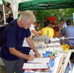 法轮功学员在伯尔尼亚洲节上的摊位吸引了很多人,还有不少人询问什么地方可以学炼法轮功。就连对面摊位忙碌的摊主也过来索取炼功点的信息,她表示看了法轮功学员炼功,觉的心里非常舒服,所以也想学炼。