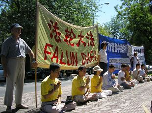 二零零八年七月三十日晚六点,法轮功学员在纽约中领馆前静坐抗议,强烈谴责中共以奥运为借口,加剧迫害法轮功。