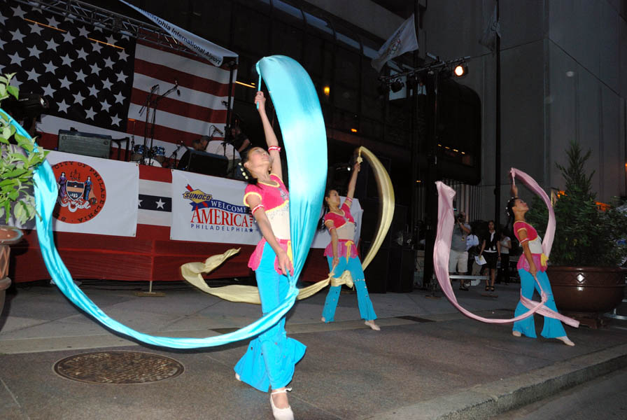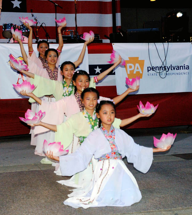 “星期三晚上出来玩”由费城国际机场赞助,邀请到了很多费城有才能的艺术家、演员、音乐家上台表演。很多人自己带椅子来欣赏。晚八点半,大费城明慧中文学校六位大法小弟子表演了四个舞蹈:插莲花、彩带舞、莲花舞、腰鼓,和法轮功五套功法演示。