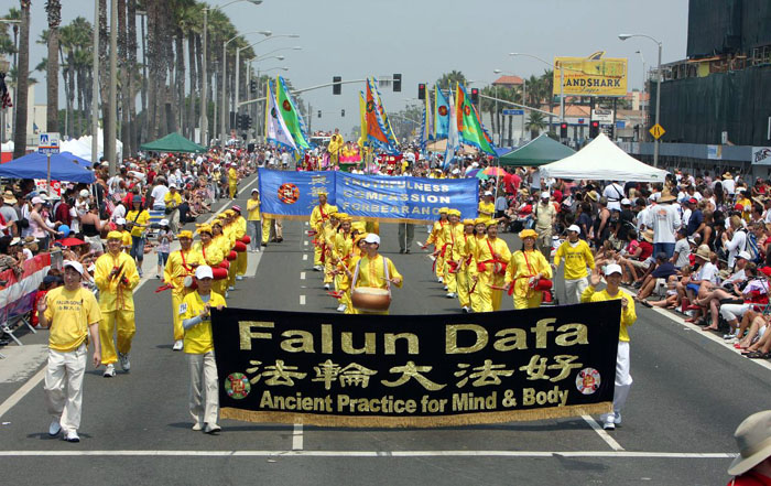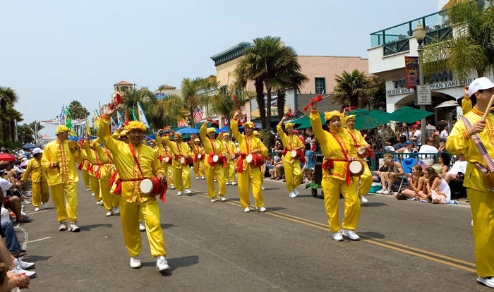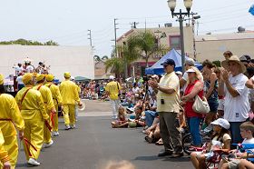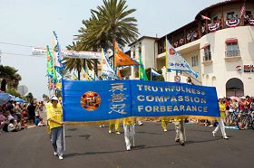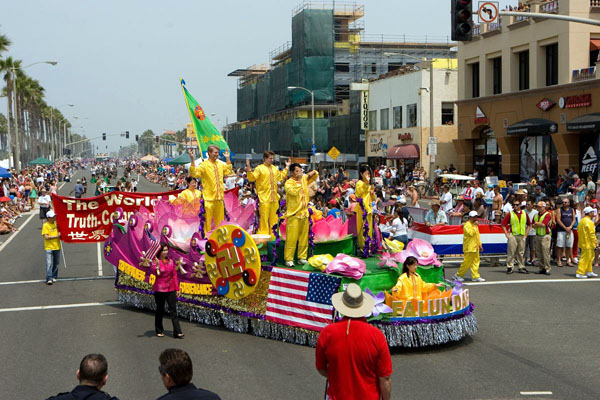 “法轮大法”、“真善忍”等中英文大横幅,和整齐的腰鼓队在丽日蓝天之下份外醒目。在传统中国古乐的伴奏下、身着白色唐装金色腰带的剑舞队有如天神临凡。而最引人瞩目的是载有炼功学员的、边上镶嵌着旋转法轮的花车。几乎所有观众都立刻认出了法轮中的卍字符,很多人从学员手中接过传单,期望了解法轮所代表的涵义。所到之处,花车有如深沉的大海,为人们带来宁静的震撼。