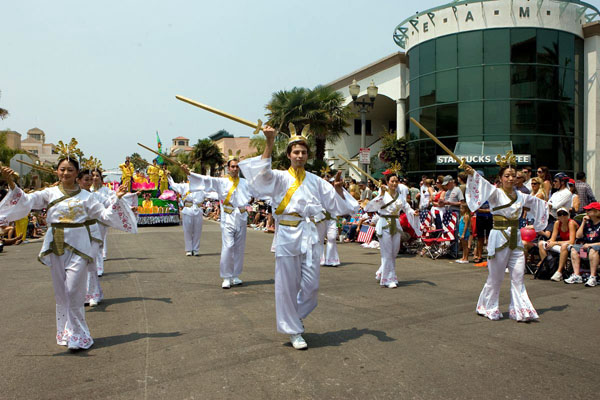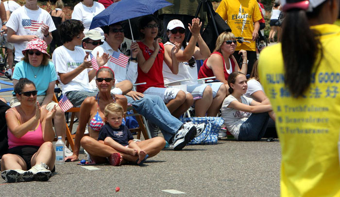 在这满街星条旗、热狗、人声鼎沸之中,唯一的华人队伍、法轮功学员为观众带来一股世外桃源般的清风。