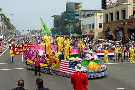游行从上午十点开始,按照传统路线从太平洋海岸一号公路开始,转缅因街(Main Street),至高瑟德路(Gothard)终止,全程约四英里,沿途观众多达数十万人。游行队伍中有花车、中学生鼓乐仪仗队、苏格兰短裙风笛队、墨西哥马术队、少儿武术学校队、老兵队、各种节目表演队等,浩浩荡荡历时三个多小时。爱热闹的美国人早在清晨六点就开始在道路两边等候。