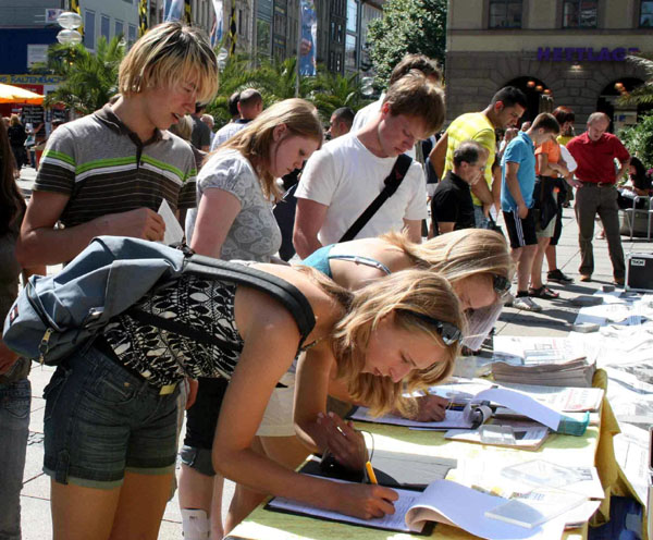 很多德国人已经通过各种渠道了解了中共对法轮功学员的迫害,因此当看到是为了谴责中共迫害法轮功而签名,马上响应。一位德国人听到中共活体摘取法轮功学员器官一事,他说:“这真是太可怕了,怎么有这么可怕的事情发生。希望你们(法轮功学员)能够坚持做下去(揭露中共的罪恶)。”有的天主教的修女也前来签名反迫害。不少台湾游客看到声援退党的横幅很开心,他们很乐意在签名簿上签字。