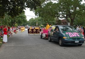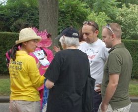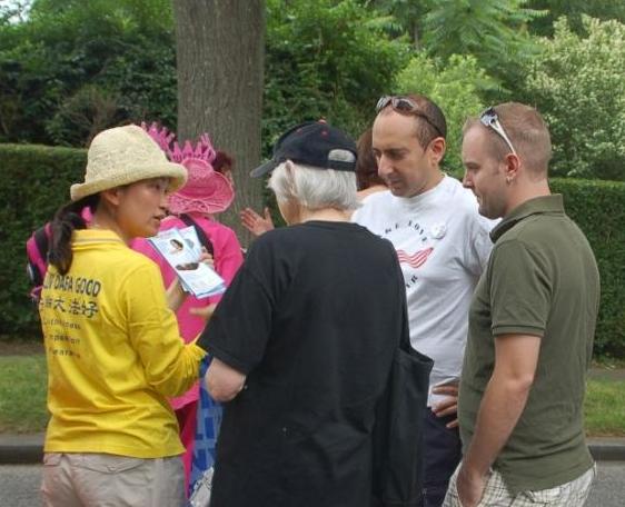 看到法轮功学员多姿多彩的游行队伍,观众们纷纷向学员索要法轮功简介。有的人主动向学员询问更多信息,有的向学员说:我知道你们,你们真了不起!