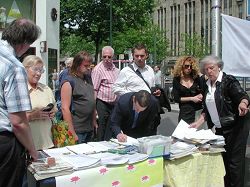 二零零八年七月五日,法轮功学员在德国北威州州府杜塞尔多夫和小城缪海姆举办了讲真相活动,向人们介绍什么是法轮大法以及过去九年来中共对法轮功修炼者的残酷迫害。
