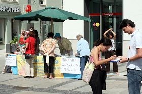 适逢周末,市中心步行街上熙熙攘攘,法轮功和大赦国际的信息台引来不少人的注意。有些德国民众过去已经了解了法轮功被中共迫害的真相,他们马上就签名了。还有不少人不了解法轮功是怎么回事,也没有听说过中共对法轮功的迫害,当他们了解了真相后,其中不少人愿意在全球百万人签名簿上签名。有一位法律学家以前听说过法轮功受中共迫害,但他开始时出于某些原因不愿意签名,在经过和法轮功学员长时间的深度交谈之后,他签下了自己的名字,支持反迫害。