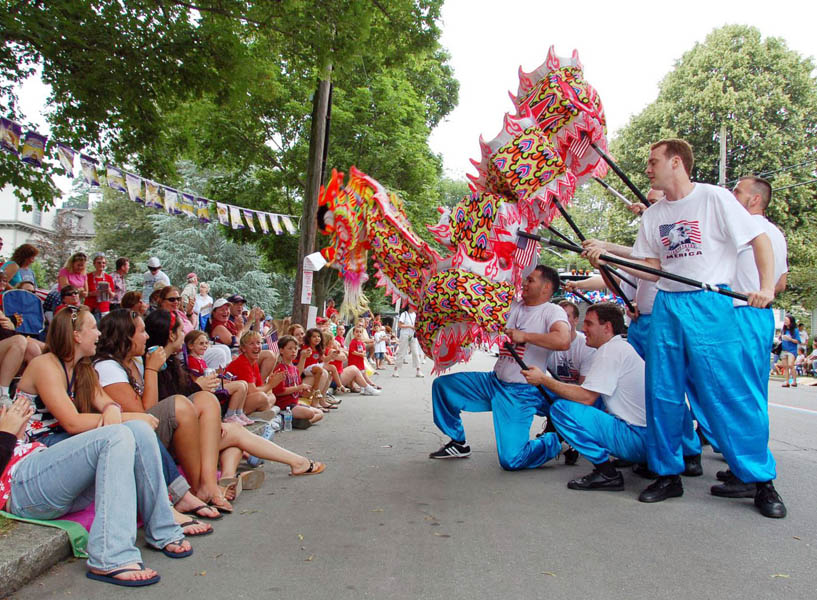 【明慧网二零零八年七月九日】二零零八年七月四日上午,在军乐声和鸣枪声中罗德岛州Bristol开始了盛大游行。来自美国各界的游行团队和花车,代表着二百多年的美国历史。今年法轮大法团队第七次被邀请参加该国庆游行,他们的唐鼓、舞龙和花车再次成为游行中的亮点。