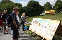 和往常一样,今天的活动照样吸引了很多的瑞典民众和来自世界各地的游客。人们一批批的从这里走过,他们有的默默的站在真相展板前观看,认真的阅读展板上的图片介绍,有的在静静观看学员演示法轮功五套功法,全然不顾烈日骄阳。