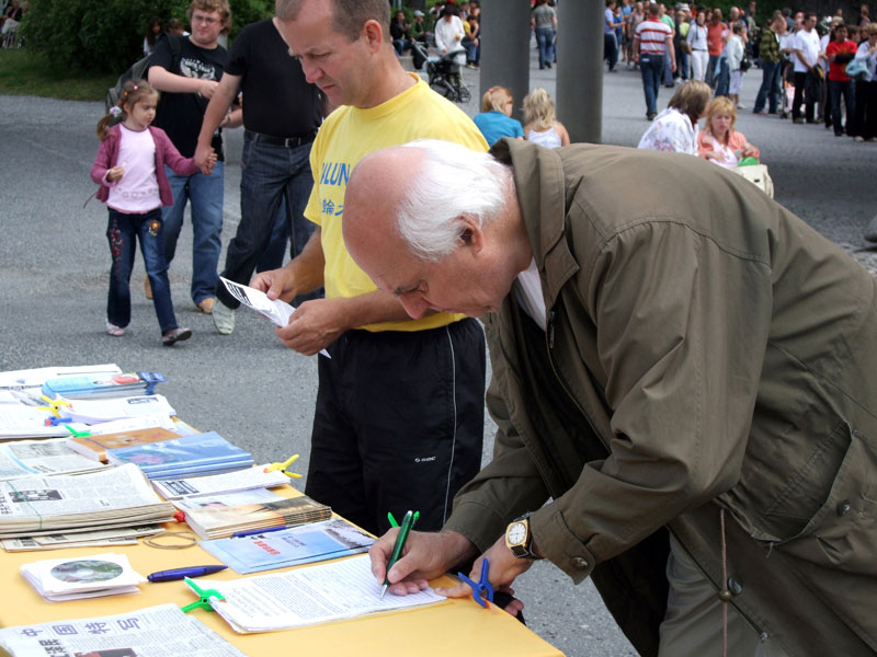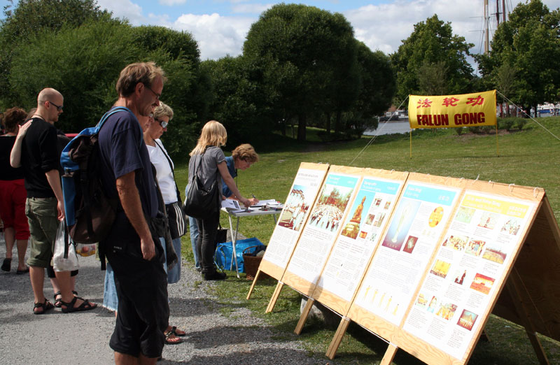 当天还来了很多从中国大陆出来观光旅游的中国人。一位了解了法轮功真相的瑞典导游一下车就冲学员招手要报纸,他是想让更多的中国人都能借这个难得的机会,了解一下国外真实的信息。其中还有一位从中国东北来的男士建议法轮功学员:“以后你们炼功的时候最好能把炼功音乐开到最大,让来这的人都能听到,那样最好。”