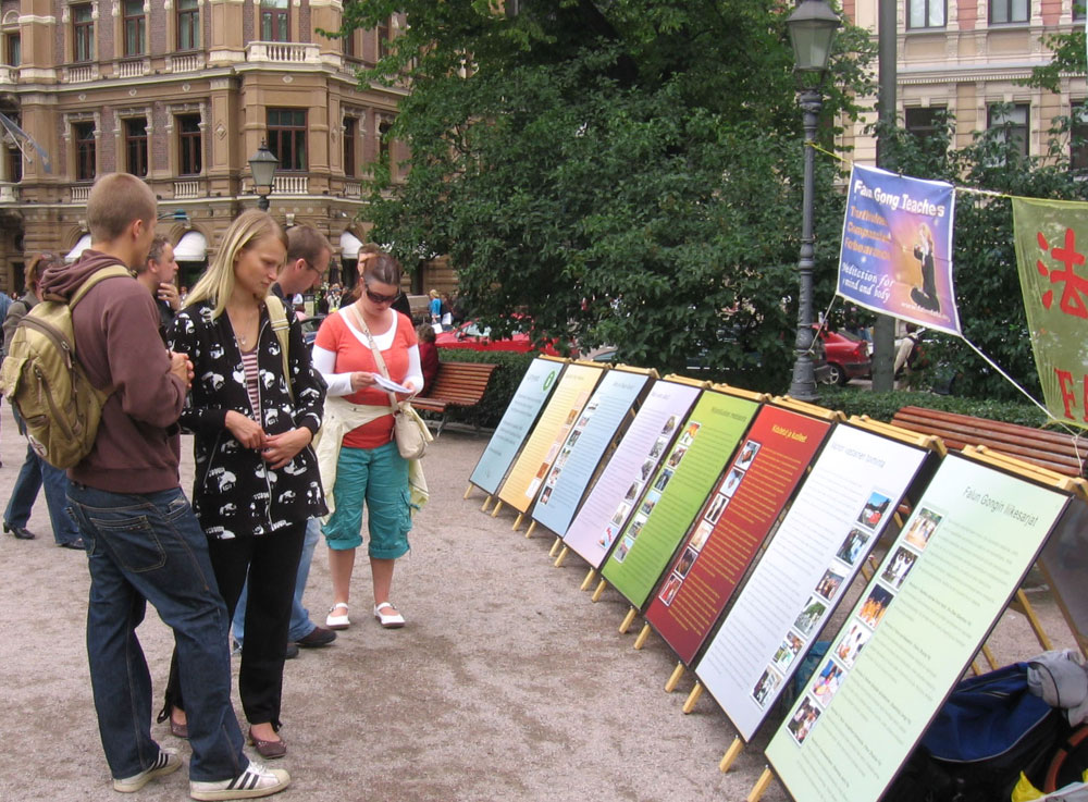 夏日的芬兰是旅游旺季,公园里,来自美国、德国、意大利、波兰、瑞典、土耳其、法国等地的游客和芬兰民众络绎不绝。当人们看到“法轮大法好”、“制止中共迫害法轮功”等横幅、听到芬兰学员Olli用喇叭介绍法轮功、以及中共邪党对法轮功学员的迫害真相时,放慢了脚步;有人接过学员递上的真相传单,边走边看,有的聆听讲解或细看展板,有的找学员询问自己的不解,还有人直接前去签名声援反迫害。