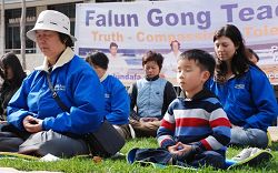 集会前,法轮功学员在广场草坪上的集体炼功。祥和的打坐和舒缓的音乐吸引了很多行人。