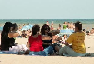 二零零八年八月十日,乌克兰东部法轮功学员在海滨城市马里乌波市举行活动,向当地民众介绍法轮大法,揭露中共对法轮功学员的迫害。