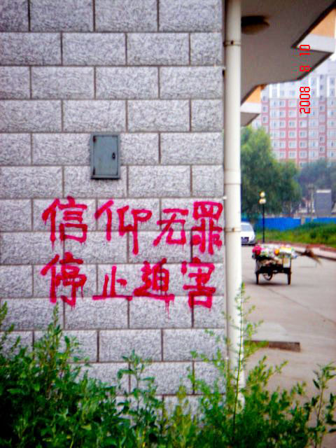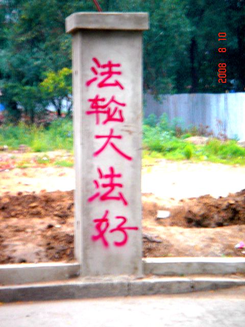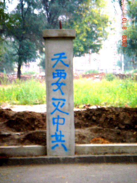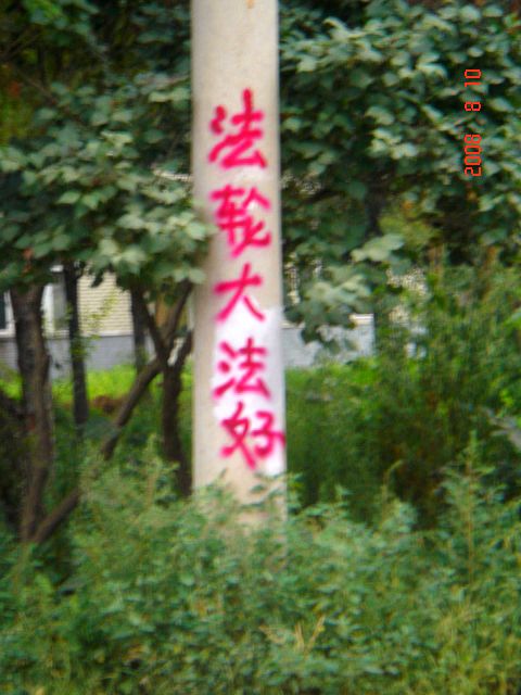 在道路两边的电线杆上、围墙上、家属楼的墙上、大树上等,出现喷漆和不干胶标语。喷漆喷出的标语有:天灭中共、退党保命、声援四千万人退党、信仰无罪,停止迫害、平反法轮功,法办江泽民。