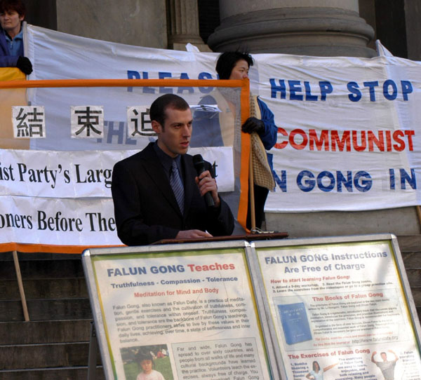 集会主持人法轮功学员布莱恩表示,中共以奥运为借口,加剧迫害法轮功。据不完全统计,从去年年底到二零零八年六月三十日,非法抓捕法轮功学员的案例就有八千零三十七宗,法轮功学员被迫害致残、致死的恶性事件持续不断。北京有超过五百名法轮功学员被捕,至少三十人被非法判刑二年半以上。