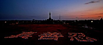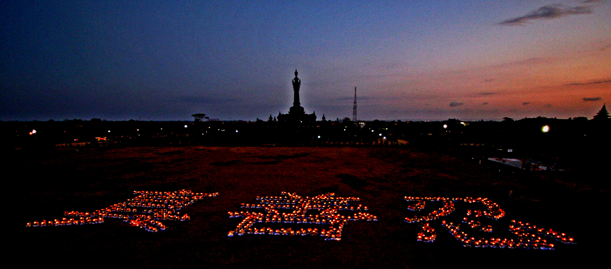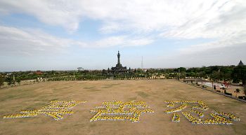 交流会的前一天,法轮功学员们还举办了游行活动,从Renon广场出发,绕着Renon区大街游行。长长的队伍分成几个部份,穿蓝衬衫的「天国乐团」当先锋开路,炼功演示队、腰鼓队、旗帜队、花车、仙女队等等随后,浩浩荡荡行进在登巴刹最繁华的街道上,特别抢眼。整个游行路程五点五公里,终站是巴厘市政府大厦前,巴厘著名的Bajra Sandhi纪念碑的北部。学员们随后在Renon广场的北面,以约千人组成了「真善忍」三个大字,然后静静点燃蜡烛,悼念在大陆被中共迫害致死的同修,气氛肃穆和庄重。