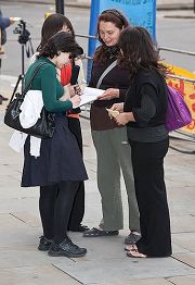 因抗议中共践踏人权而被从北京遣返的英国女士苔丝,决定在中使馆前进行抗议。她也在一旁声援法轮功学员的活动,并积极的向过往的人发法轮功传单,并同时拿着法轮功反迫害征签表征签。不少人在和苔丝简短交谈后在征签表上签了字。