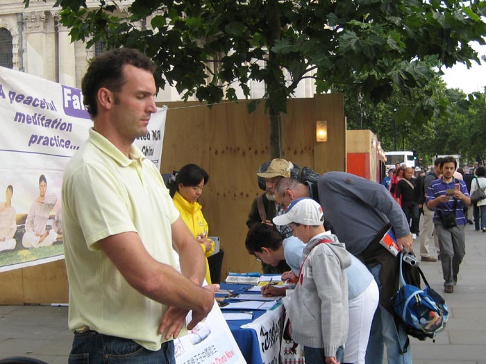 记者发现法轮功学员的真相展示也吸引了一些华人的关注。一对家住伦敦的泰国夫妇对法轮功学员的功法展示观看很久,记者上前询问后发现其中的丈夫是华人,会说普通话,而同样东方面孔的太太是泰国人,只会说英语。这位太太随即急迫的向记者询问在哪里可以学法轮功,而丈夫更急于知道怎样才能得到法轮功的书。当被告知伦敦摄政公园周末义务教功点的信息以及可以上网查到所有法轮功的著作后,夫妇二人显的非常高兴。接着,泰国妻子向记者表示她对这样平和的功法受到中共迫害不能理解、不能接受,而华人丈夫则在反迫害征签表上签了名。