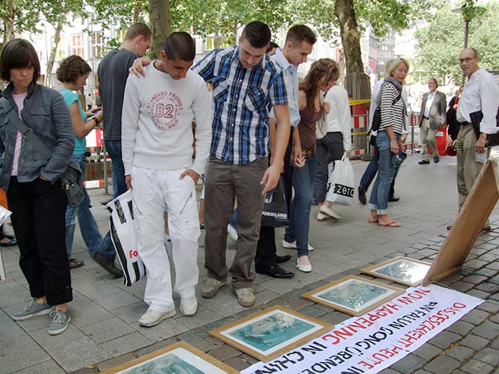 因为周末,汉堡街上购物、观光的人流不断。有的人看了真相展板,立刻签名;有的路过时听了学员们的喇叭广播,主动索要传单;有的匆匆接了传单而过,回来时又要求再多给他一些,要发给自己的亲朋好友;也有人将看完的传单还给学员,说希望这张传单能让另一个人知道真相……