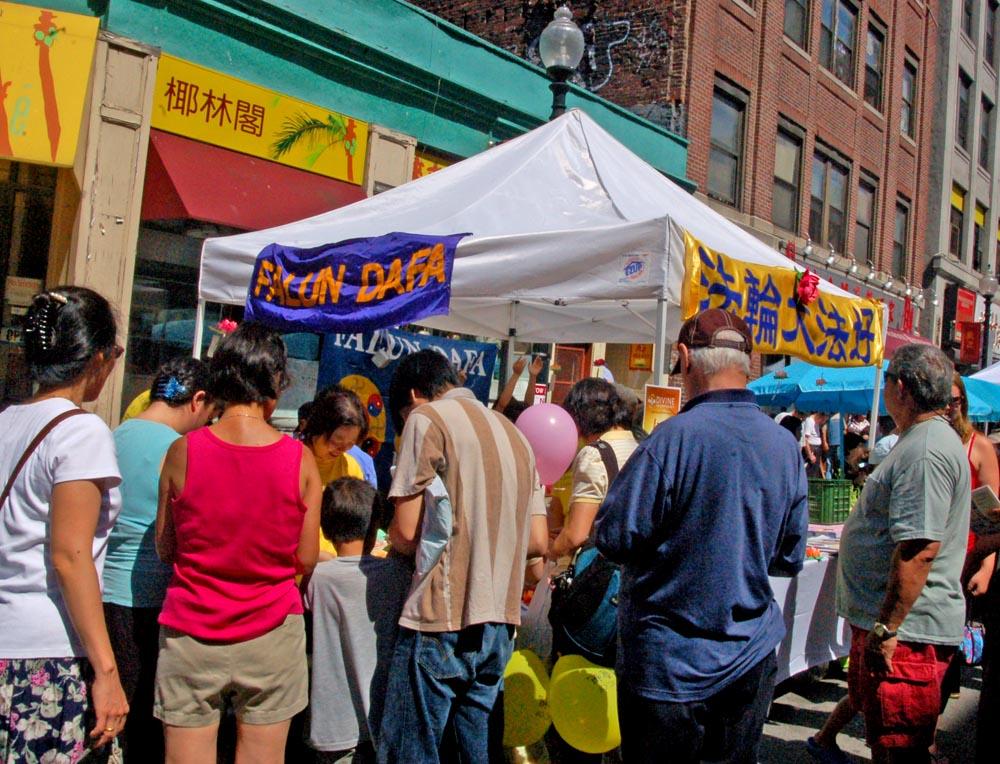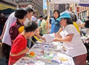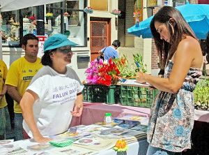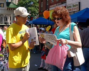 一位来自中国大陆的留学生静静的听法轮功学员讲了很长时间,不断的点头表示赞同,并为法轮功所遭受的残酷迫害感到震惊。她要了真相资料,并表示回去后,会仔细阅读。