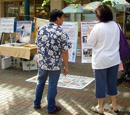 【明慧网二零零八年八月二十日】二零零八年八月十七日,美国夏威夷法轮功学员继续在夏威夷州首府檀香山市的中国城进行讲真相的活动,揭露中共以奥运会为由对海内外法轮功学员加剧迫害。学员们在发放各种真相材料的同时,打出“中共的迫害违背奥运精神”的标语,引来不少路人驻足观看。