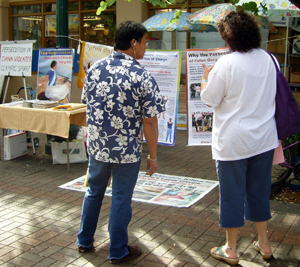 很多路人对中共以奥运为借口继续人权迫害表示气愤。一对西人夫妇与法轮功学员进行了长时间的交谈,较为深入的了解了法轮功真相,对于中共活摘器官的罪行表示震惊。不少当地的华裔居民也对法轮功学员长期坚持讲真相表示赞许。
