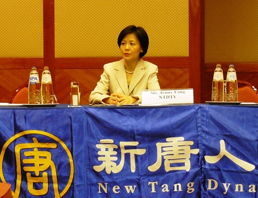 ![]() 新唐人电视台公共关系部负责人方菲女士在新闻发布会上 |