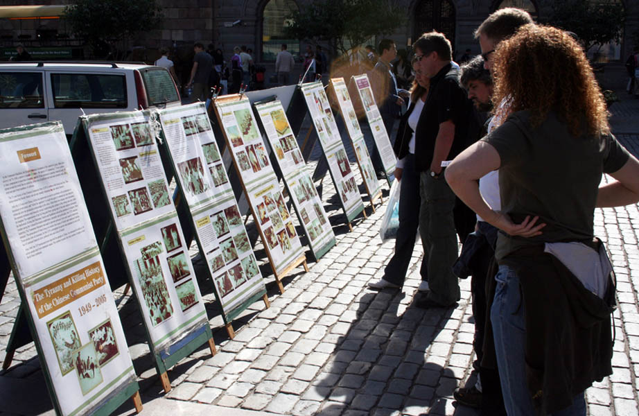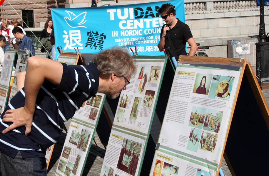 一位穿着讲究、满头白发的老人经过这里时,法轮功真相展板吸引了她。老人仔细的读了一遍,然后就和法轮功学员硕士生小刘聊了起来。原来这位老人的父母有一位好友一直生活在中国,他们有三个孩子,这三个孩子的中文比瑞典文讲的还好。她和他们经常联系。所以她对中国的问题比较清楚,她也很关心中国的人权状况。她对小刘说:“你们做这件事很值得。中国的现在的状况就是中共长期欺骗民众、封闭信息,给人们长期洗脑造成的。这就是共产集权的邪恶所在,它完全是靠谎言来维持着自己的统治地位。它的谎撒的使得头脑不是很清楚的人都分辨不出来是谁在撒谎了。”老人只知道共产党邪恶,但她还没想到会邪恶到这种程度:“把活人(法轮功学员)的器官就敢摘取,这简直是太残忍了!”她走到桌子前庄重的签下了自己的名字,表达自己支持法轮功,谴责中共的暴行。她还拿了瑞典文的《九评共产党》,表示回去要再好好的读读并讲给其他人。