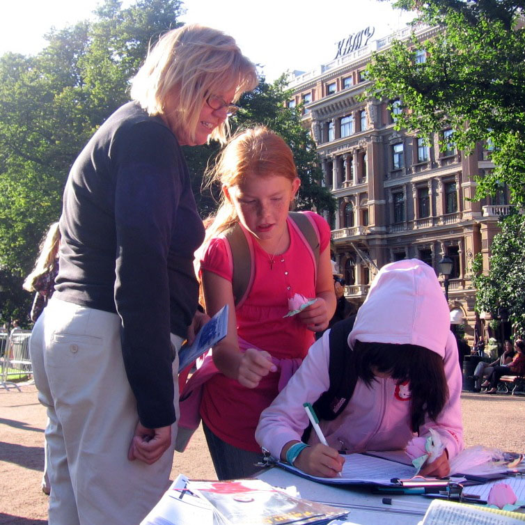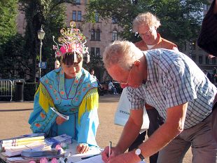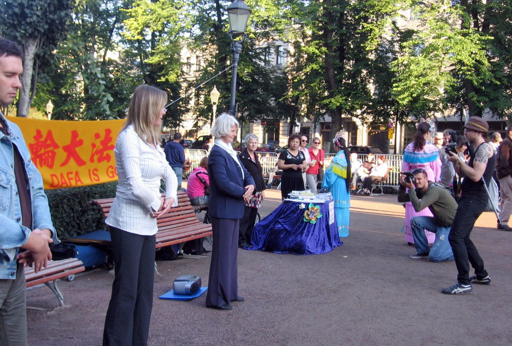 法轮功学员在公园中央挂起醒目的“法轮大法好”横幅,在小桌上摆放了芬、中、英、俄、瑞典等多种文字的真相资料,并征集制止中共迫害法轮功的签名。几位年轻女学员穿着漂亮的中国古代仕女服,向川流不息的人们散发资料,并将学员折叠的纸莲花赠送给过往的小朋友和老年人。一些人饶有兴致的和穿着仕女服的学员合影留念。