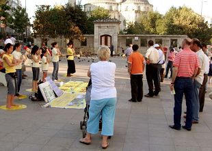 一位穿着讲究、满头白发的老人经过这里时,法轮功真相展板吸引了她。老人仔细的读了一遍,然后就和法轮功学员硕士生小刘聊了起来。原来这位老人的父母有一位好友一直生活在中国,他们有三个孩子,这三个孩子的中文比瑞典文讲的还好。她和他们经常联系。所以她对中国的问题比较清楚,她也很关心中国的人权状况。她对小刘说:“你们做这件事很值得。中国的现在的状况就是中共长期欺骗民众、封闭信息,给人们长期洗脑造成的。这就是共产集权的邪恶所在,它完全是靠谎言来维持着自己的统治地位。它的谎撒的使得头脑不是很清楚的人都分辨不出来是谁在撒谎了。”老人只知道共产党邪恶,但她还没想到会邪恶到这种程度:“把活人(法轮功学员)的器官就敢摘取,这简直是太残忍了!”她走到桌子前庄重的签下了自己的名字,表达自己支持法轮功,谴责中共的暴行。她还拿了瑞典文的《九评共产党》,表示回去要再好好的读读并讲给其他人。