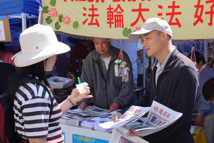 从中国大陆到美国旅游的刘女士星期天来到法轮功的展位。当她接过法轮功学员递过去的真相资料时,有人警告她不要拿,还威胁她说,拿法轮功的资料,回国后中共会抓她。刘女士气愤的表示,共产党太坏了,她家里被中共定为“黑五类”,她恨共产党。她当场退出了以前加入的中共组织少先队。