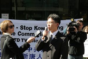 前悉尼中领馆官员陈永林先生也来到集会现场揭露中共:“早在二零零五年四月,当时我还在中领馆工作,中国外交部给海外各使领馆发了一份文件,表扬中共驻欧洲领事馆人员工作成绩卓越,成功停止了欧卫与《新唐人电视台》的合同。到目前为止,新唐人节目是唯一不受中共审查的对华播出的节目,让大陆人能看到、听到发生在中国对人权的迫害真相,以及海外发生的种种中共不愿让民众知道的消息。这份文件表明中共在欧卫中止与新唐人的合同问题上是下了很大的功夫。当时中共的一个代表团直接访问了欧卫的总部,谈到了在奥运问题上与欧卫的合作。欧卫看到了好处,当时决定不再与新唐人签约。此次在奥运之前借‘技术故障’,中止合同,完全是受中共金钱利诱而做出的妥协,放弃了作为一个西方媒体坚持媒体新闻自由的原则。”