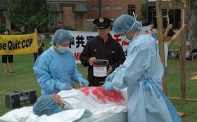 ![]() 现场演示中共活摘法轮功学员器官。 |