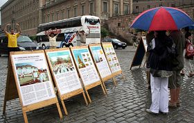 二零零八年八月二日上午,瑞典法轮功学员和往常一样来到斯德哥尔摩皇宫旁的钱币广场上,打出蓝底黄字中英文“停止迫害法轮功”的横幅,摆放上法轮功的真相展板,继续向来自世界各地的民众介绍法轮功,并讲述中共九年来迫害法轮功的暴行。