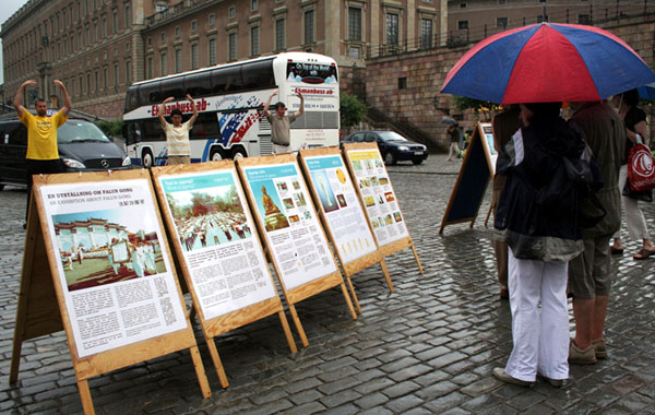 ![]() 人们冒雨在认真的观看法轮功真相展板 |