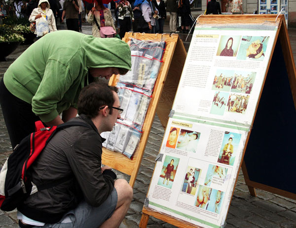 一对中年夫妇在展板前认真的观看,两个人顶着雨把所有的展板都仔细的读了一遍,连连的摇着头,他们被中共的残暴所气愤,又被眼前这些善良的法轮功学员所感动。“这真是善与恶的鲜明对比啊!”他们在签字簿上签上了自己正义的呼声。