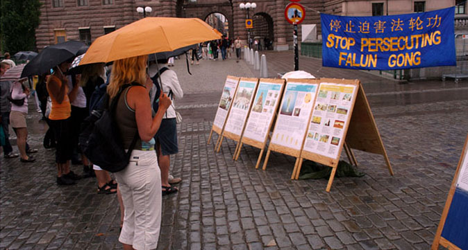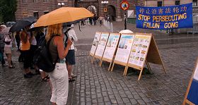 西人法轮功学员戊维(Ove)住在哥德堡的北部,今天他是坐了四、五个小时的火车赶到这里的,来到这以后他顾不得旅途的劳累,打着雨伞手拿真相传单向路人发放,并不停的向人们讲述着现在在中国正在发生的事情。