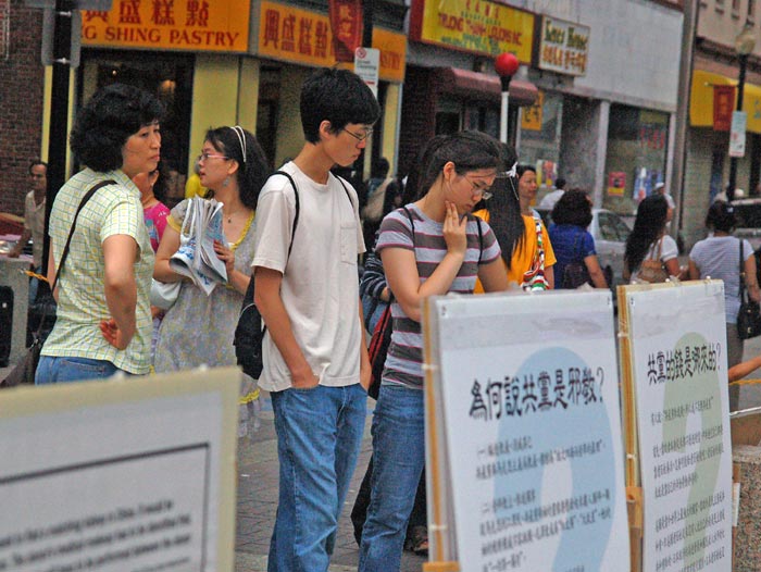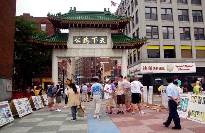 ![]() 波士顿中国城“天下为公”牌坊两侧,展示四十个真相展板。 |