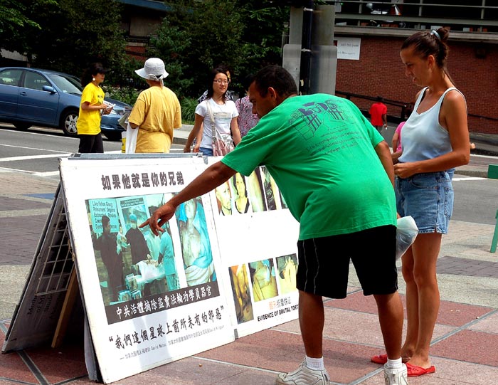 一位由大陆来美的年轻从商者表示,他虽然曾听说过法轮功被迫害的事,但是亲眼看到中共残忍迫害法轮功的展板,还是很惊讶!他感慨的说,“在国内没有机会看到这些展板啊!”于是拿着相机对着真相展板一一拍照留念。