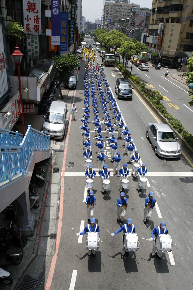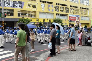 【明慧网二零零八年八月四日】(明慧记者李慧容、刘文新台北县采访报导)为了让台北县中和市民得知“真善忍国际美展”在中和市公所展出,法轮功学员于二零零八年八月二日中午在市公所附近游行。吹奏着“法轮大法好”的整齐划一的天国乐团表演吸引许多市民的驻足观看。