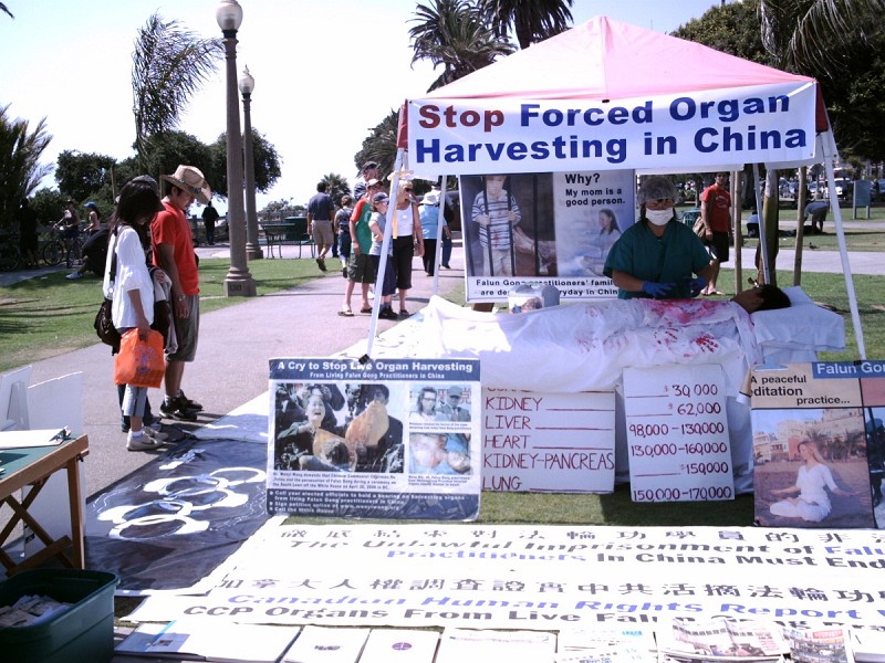 圣塔莫尼卡法轮功学员在这里的海滩公园摆设摊位,揭露中共迫害法轮功的真相,已经快三年了。每个星期天的下午,学员都准时到来,摆开展板、横幅、不同语种的传单、资料、征签表,并以模拟演示揭露中共活摘法轮功学员器官的罪恶。很多人受到震撼,强烈谴责中共的暴行,对法轮功学员无辜被迫害表示极大同情。