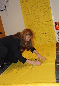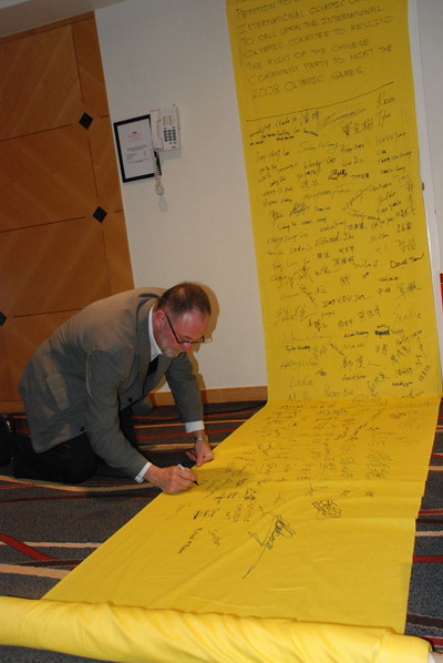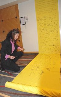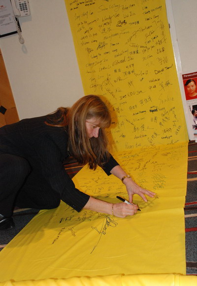 ![]() 国际特赦发言人Margaret Taylor 女士在征签布上签名支持法轮功 |