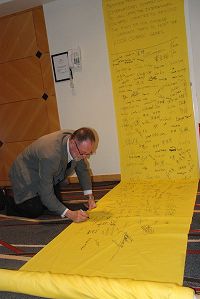 ![]() 新西兰Kiwi党秘书 Bernie Ogilvy 先生在征签布上签名支持法轮功 |