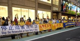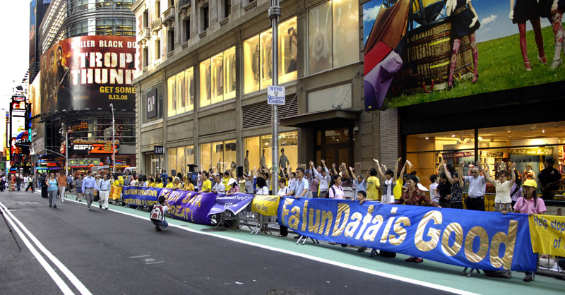 ![]() 法轮功学员在纽约四十二街时代广场和平集会,揭露中共对法轮功的血腥迫害。 |