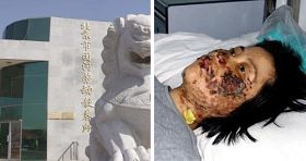 中国装饰的劳教所外表掩盖着内里的恐怖。左面是团河劳动教养所,右面是法轮功学员高蓉蓉在马三家劳教所被迫害致死之前被毁容。