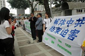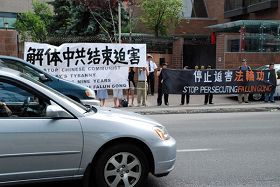 二零零八年八月八日,澳洲昆士兰法轮功学员再次聚集在布里斯本中领馆前,呼吁立即制止中共对法轮功长达九年的迫害。