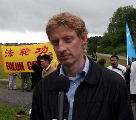 二零零八年八月八日下午一点,在中国驻瑞典使馆前,瑞典国际记者无疆界组织、瑞典支持中国人权组织等多个人权组织和议员一起冒雨举行了集会,抗议中共关押记者、封锁新闻自由、违背对国际奥委会和国际社会关于言论自由的承诺,并要求中共当局释放在中国被关押骚扰的新闻工作者和维权人士、法轮功学员。