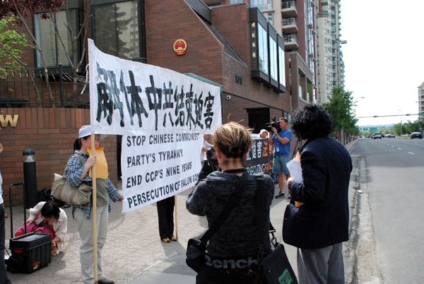 二零零八年八月七日,加拿大卡尔加里法轮大法学会和法轮功受迫害真相联合调查团在中领馆前举行新闻发布会,抗议中共以奥运为借口,加剧迫害法轮功。主流媒体有CTV,GLOBAL TV,Calgary SUN 和Metro等到场进行了采访。
