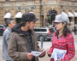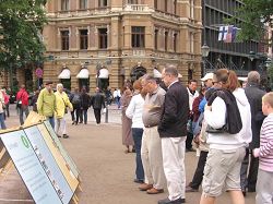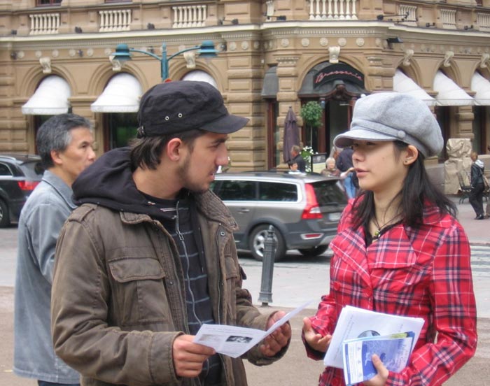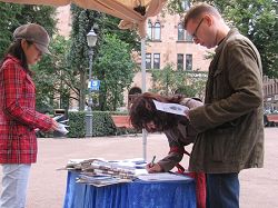 来自瑞典小城Väljö的白尔洁(Birjilh)女士主动的找到学员索要资料,并签名声援停止迫害。她说:“我是从我们那的广播里听到法轮功的”,并希望能够多了解一些。又有一位男士,询问学员有没有更多的瑞典语资料。在拿到了瑞典语版的大纪元报纸和《九评共产党》后很高兴的离开了。